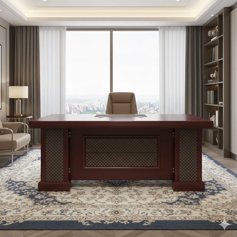 Màu sắc của bàn thường là nâu vân gỗ hoặc nâu đỏ, phù hợp với phong cách nội thất phòng lãnh đạo. Tông màu này cũng dễ kết hợp với ghế giám đốc da và tủ tài liệu cùng màu để tạo sự đồng bộ cho văn phòng.