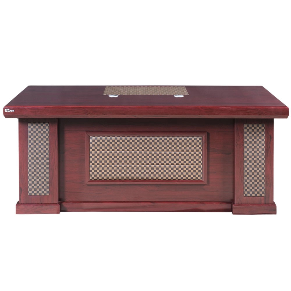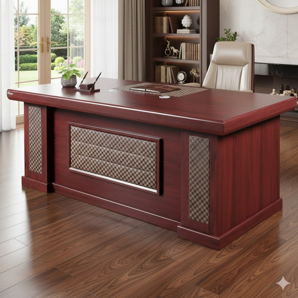 Bàn có thiết kế sang trọng và bề thế, phù hợp với phòng trưởng phòng hoặc phòng giám đốc. Các chi tiết trang trí như tấm PVC trên mặt bàn và yếm bàn ốp nổi giúp sản phẩm tạo điểm nhấn thẩm mỹ và tăng sự chuyên nghiệp cho không gian làm việc.