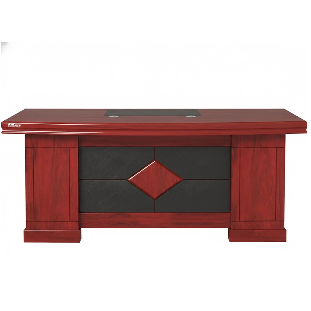 Bàn có kiểu dáng hình chữ nhật rộng rãi, phần cạnh trước được thiết kế lượn cong nhẹ giúp tổng thể sản phẩm mềm mại hơn so với bàn chữ nhật truyền thống. Phía trước bàn là yếm bàn dạng lớn, ốp nổi tấm PVC màu đen trang trí, tạo điểm nhấn nổi bật và tăng tính thẩm mỹ cho khu vực làm việc của người lãnh đạo.