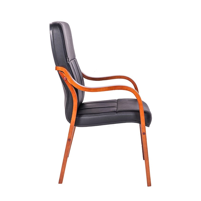 Phần tựa lưng và mặt ngồi liền khối, tạo cảm giác chắc chắn, dáng ghế thẳng, phù hợp tư thế ngồi họp ngắn đến trung bình. Bề mặt ghế được bọc đệm mút vừa phải, phủ ngoài bằng da công nghiệp hoặc PVC (tùy phiên bản), dễ lau chùi, ít bám bụi. Tay ghế bằng gỗ uốn cong nhẹ, giúp đặt tay thoải mái khi ngồi họp.
